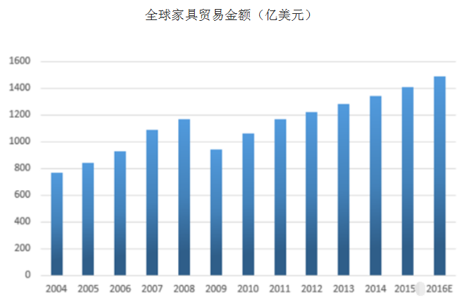 根據(jù)米蘭工業(yè)研究中心 (The Centre for Industry Studies, 以下簡稱“CSIL”)的統(tǒng)計,世界家具貿(mào)易總額規(guī)模從 2005 年的 850 億美元增長至 2014 年的 1,340億美元,據(jù)其預(yù)測,2015 年世界家具貿(mào)易總額將增至 1,410 億美元,2016 年會沿襲增長趨勢,達到 1,490億美元。從 2005 年至 2016 年世界家具貿(mào)易總額的變動趨勢來看,雖然 2008 年的全球金融危機對全球家具生產(chǎn)和貿(mào)易造成一定的沖擊,但隨著全球經(jīng)濟的逐步復(fù)蘇,發(fā)達國家的消費能力逐步恢復(fù)并增長,2011年全球家具貿(mào)易金額基本恢復(fù)到金融危機之前的水平,同時,新興國家和地區(qū)的消費能力逐步增強,全球家具貿(mào)易金額呈現(xiàn)增長趨勢。