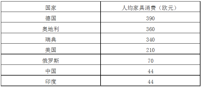 根據(jù)德國家具工業(yè)協(xié)會數(shù)據(jù),歐洲總體家具支出高于其他地區(qū),其中,2013年德國人均家具消費全球最高,達到 390 歐元。美國作為世界家具消費大國,人均家具支出為 210 歐元,而中國人均家具消費遠低于國際平均水平,大約在 44歐元。美國、中國等國家人均家居消費與歐洲的差距預(yù)示著巨大的家具消費提升空間。