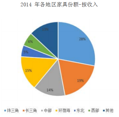 與此同時,目前我國家具業(yè)發(fā)展呈現(xiàn)明顯的產(chǎn)業(yè)集群效應(yīng)。2014 年我國各地區(qū)家具份額(按收入)占比前四名分別為“珠三角”、“長三角”、環(huán)渤海三角洲家具工業(yè)區(qū)與中部家具工業(yè)區(qū)。 其中“珠三角”和“長三角”擁有豐富的勞動力資源以及技術(shù)資源,相較其他地區(qū)有較為明顯的優(yōu)勢,歷來是我國家具業(yè)發(fā)展重地。2014 年,這兩個地區(qū)的家具產(chǎn)量合計占全國總量的 72%。